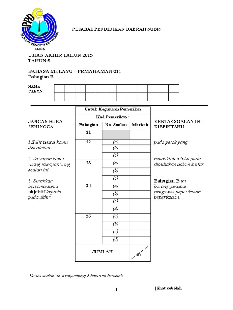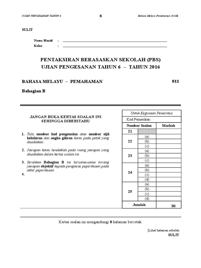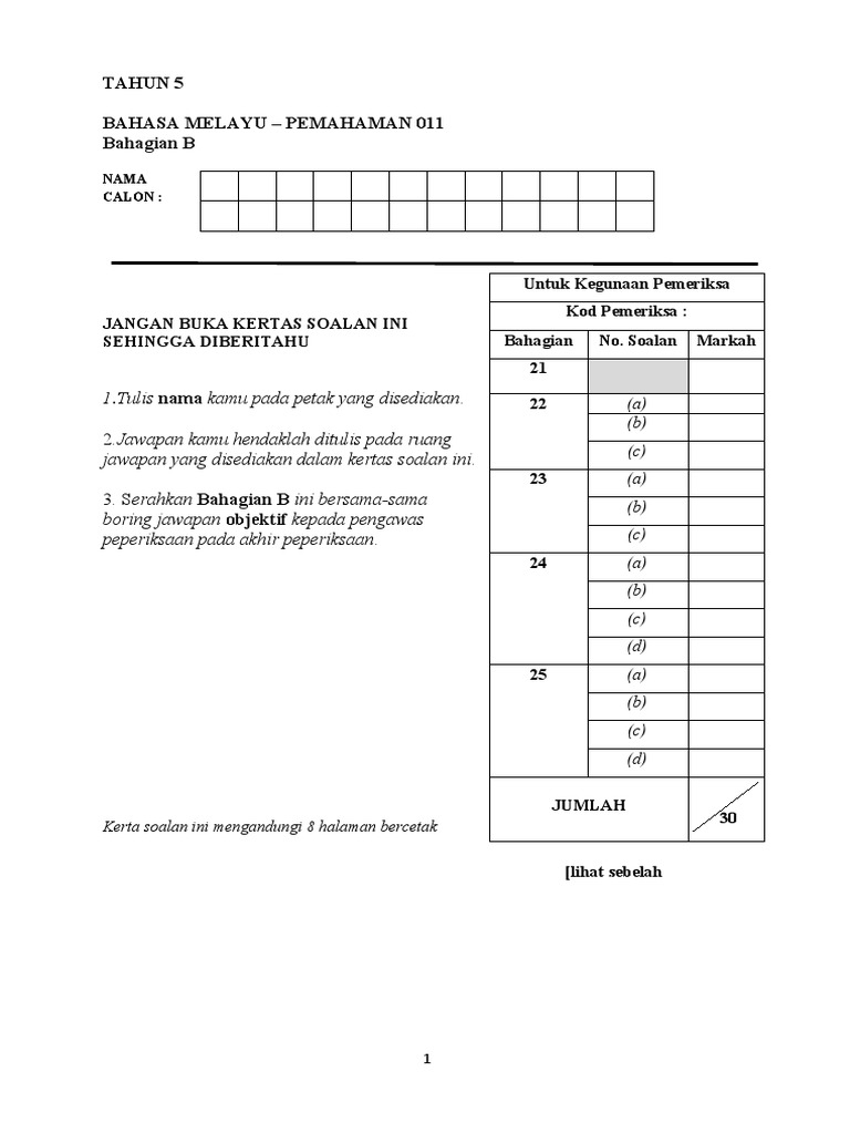 Bm 011 Bhg B 2016 1 Docx Tahun 5 Bahasa Melayu U2013 Pemahaman 011 Bahagian B Nama Calon Kodpemeriksa Jangan Buka Kertas Soalan Ini Sehingga Diberitahu Course Hero