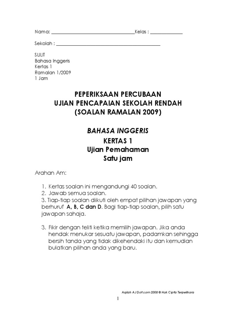 Ujian Pra-upsr Bahasa English Jawapan