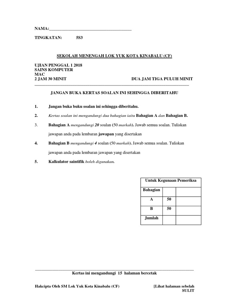 Ujian 1 Sains Komputer Tingkatan 5 2018