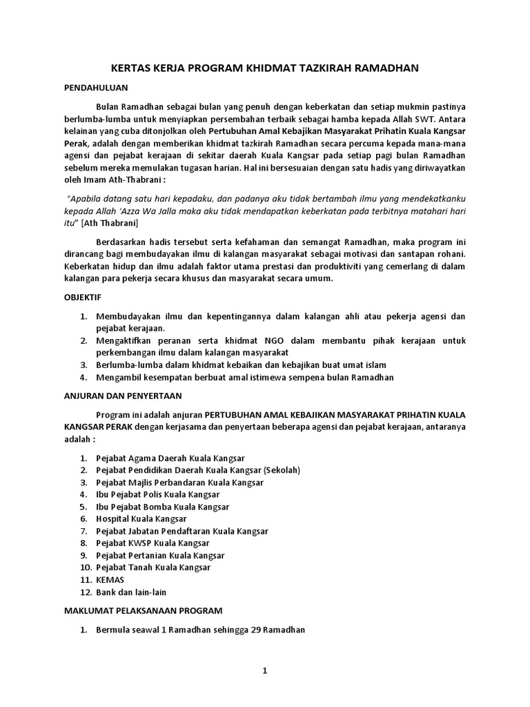 Kertas Kerja Program Khidmat Tazkirah Ramadhan Pagi Percuma