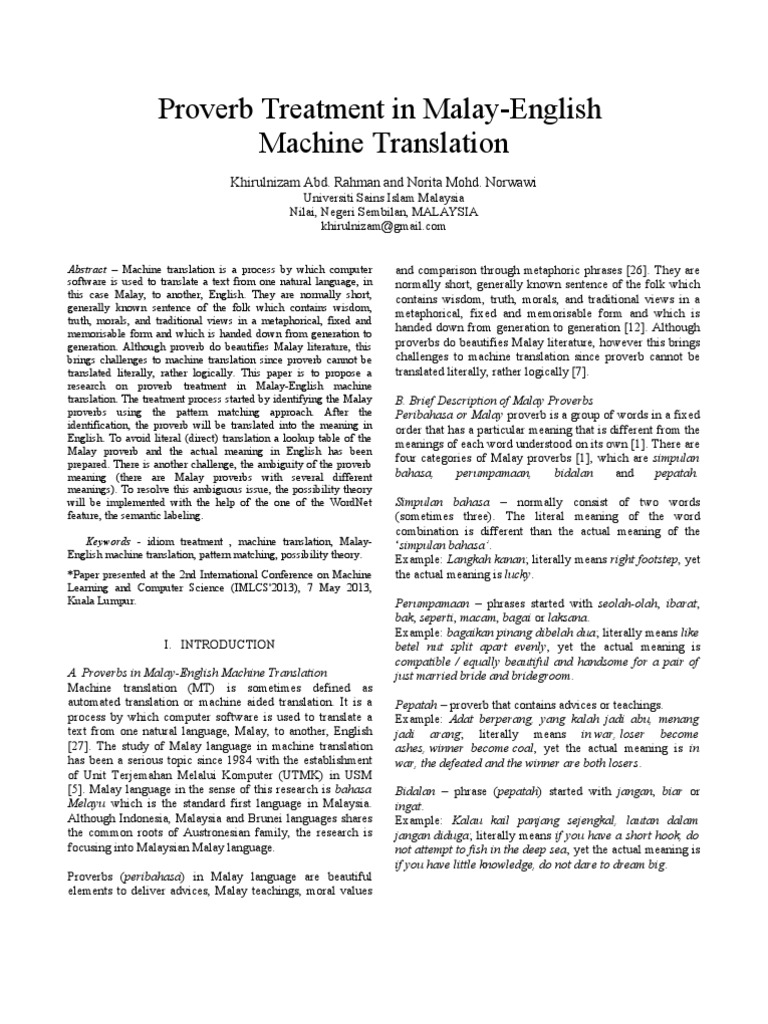 Proverb Treatment In Malay English Machine Translation Idiom Translations