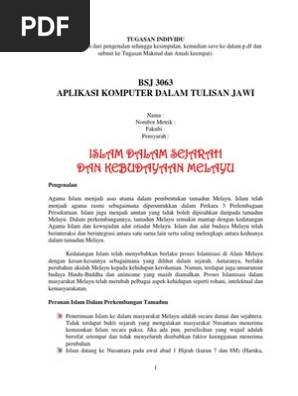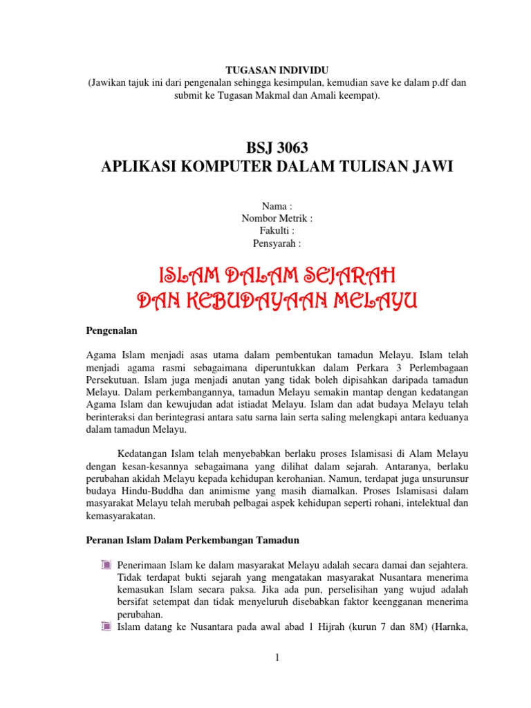 Islam Dalam Sejarah Dan Kebudayaan Melayu Bsj 3063 Aplikasi Komputer Dalam Tulisan Jawi