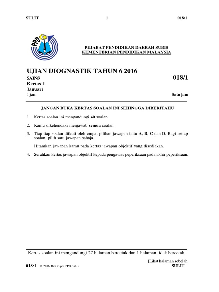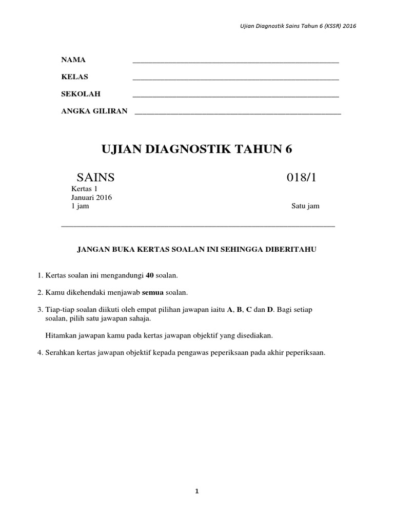 Sains Kertas 1 Ujian Diagnostik T6 Kssr 2016 Pdf