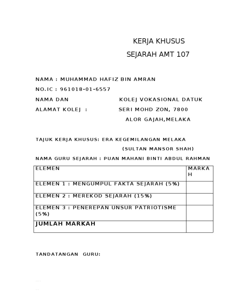 Contoh Kerja Kursus Sejarah Pt3 2019 Kesultanan Melayu Melaka