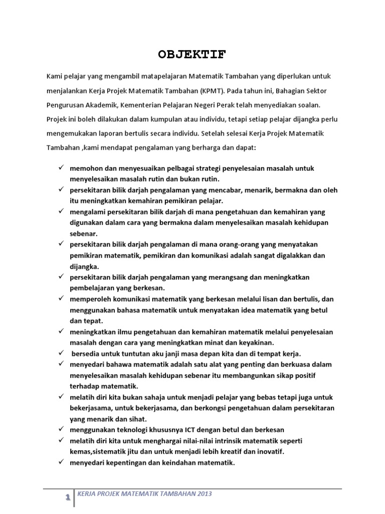 Doc Kerja Projek Matematik Tambahan 2013 Seramai 34 826 Pelajar Dijangka Akan Menduduki Peperiksaan Spm Di Taufaik Ahmad Academia Edu