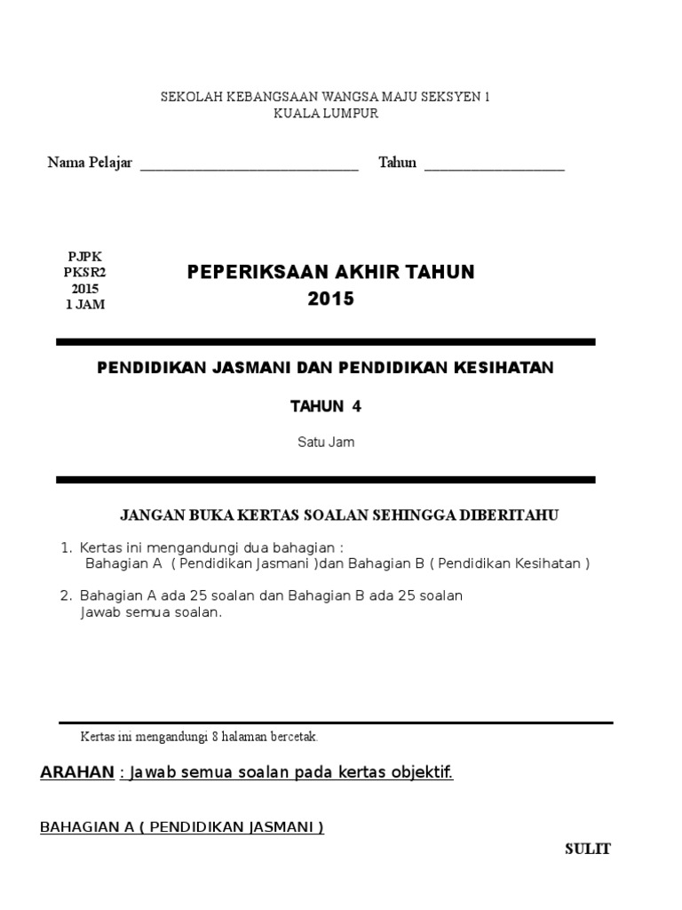 Soalan Akhir Tahun Pendidikan Jasmani Tahun 6 E Perkhidmatan
