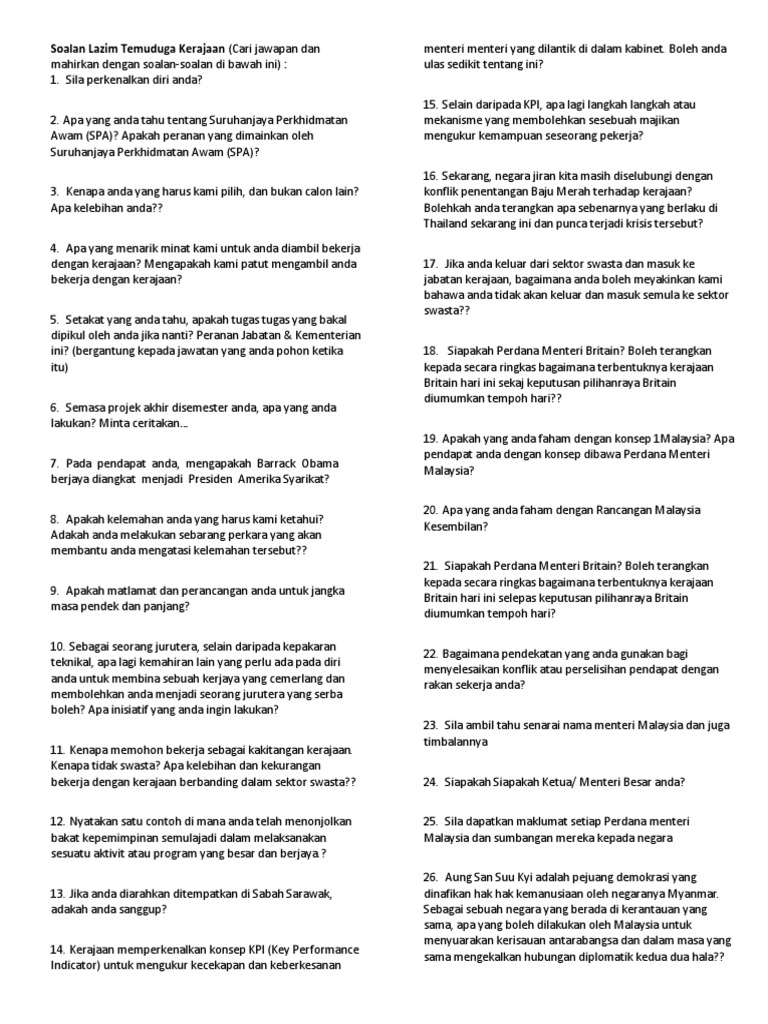 Contoh Soalan Temuduga Spa Dan Temuduga Kerja Kerajaan Docx Document