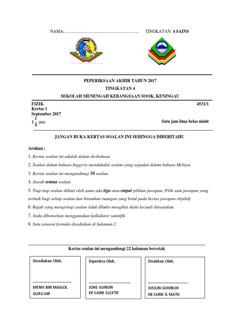 Peperiksaan Akhir Tahun 2017 Tingkatan 4 Sekolah Menengah Kebangsaan Sook Keningau Fizik 4531 1 Kertas 1 September 2017 Satu Jam Lima Belas Minit