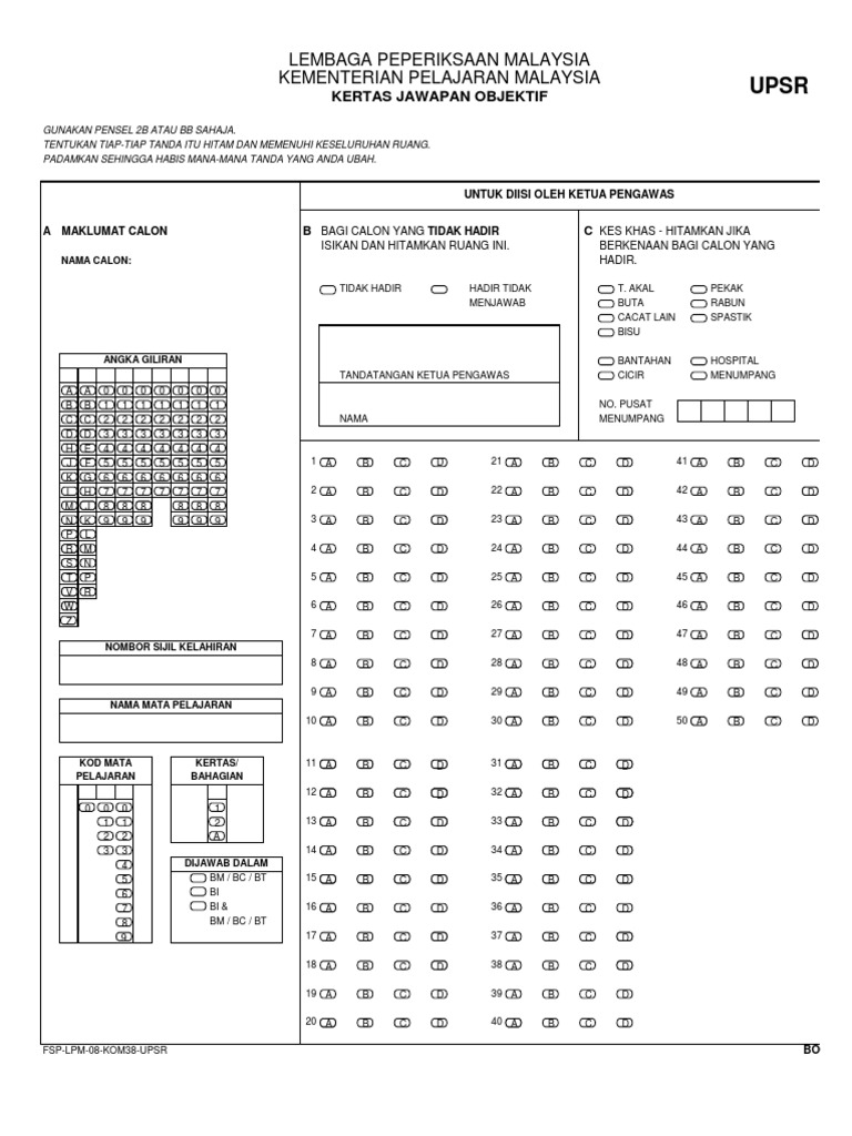 Contoh Kertas Jawapan Objektif Upsr Anirasota